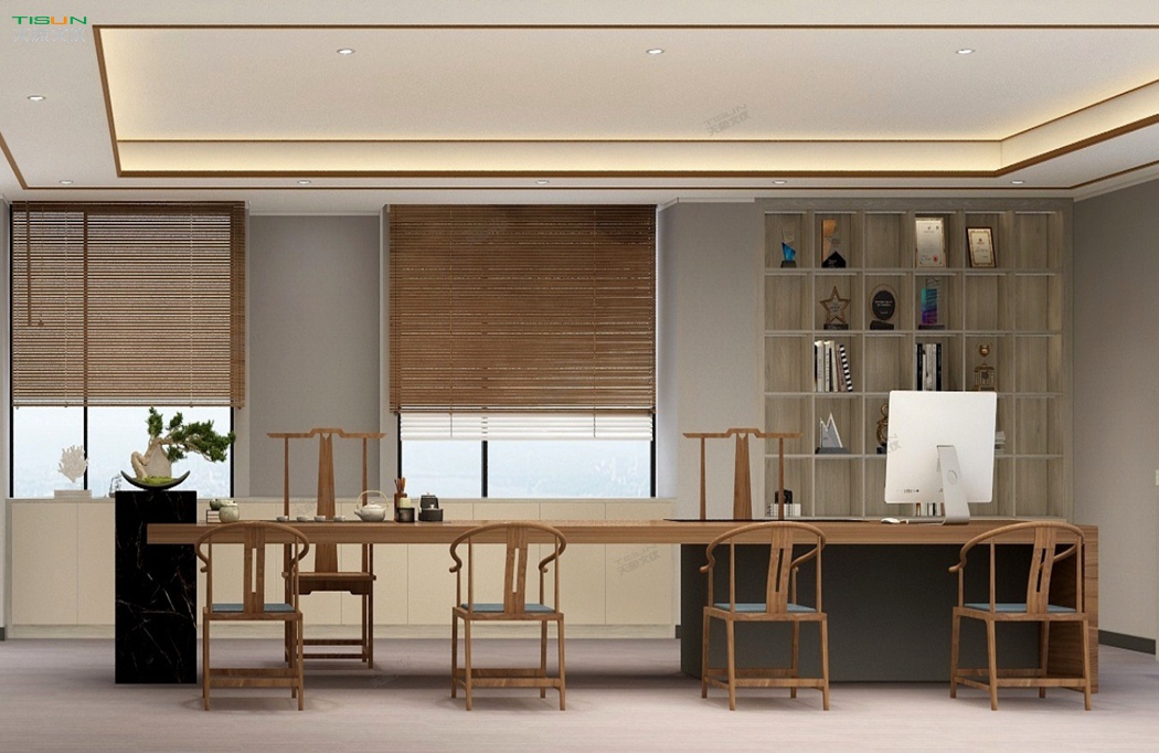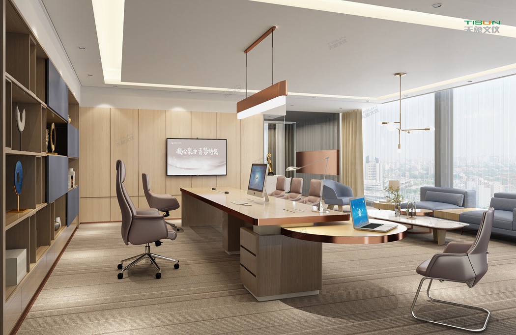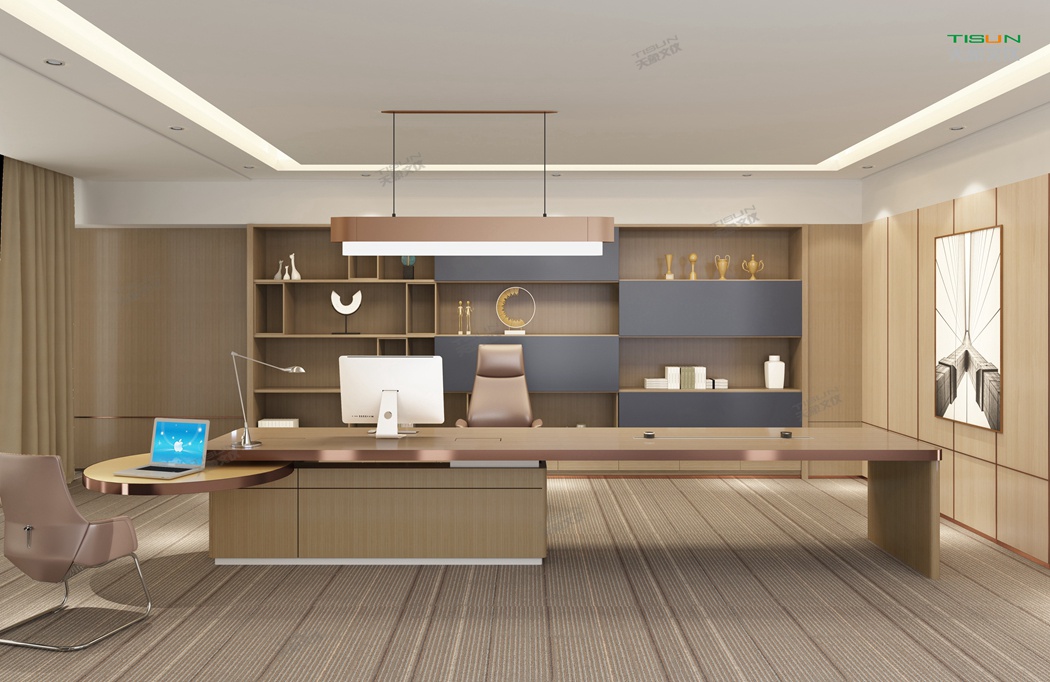 This office furniture is simple in shape, with a small number of turning lines to enrich the connotation of product design. It is matched with the overall customized background wall and bookcase to show the social status and identity of users with a sense of massiness.